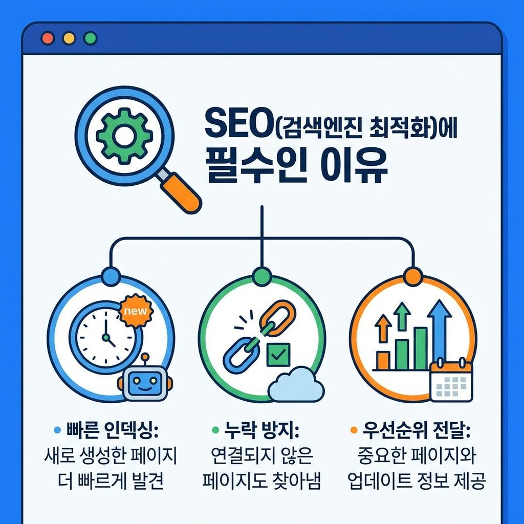SEO 최적화의 첫걸음은 검색 엔진에 우리 집 지도를 건네주는 것입니다. 사이트맵은 웹사이트 내 모든 페이지 정보를 나열한 XML 형식의 지도로, 다음과 같은 핵심 역할을 수행합니다.